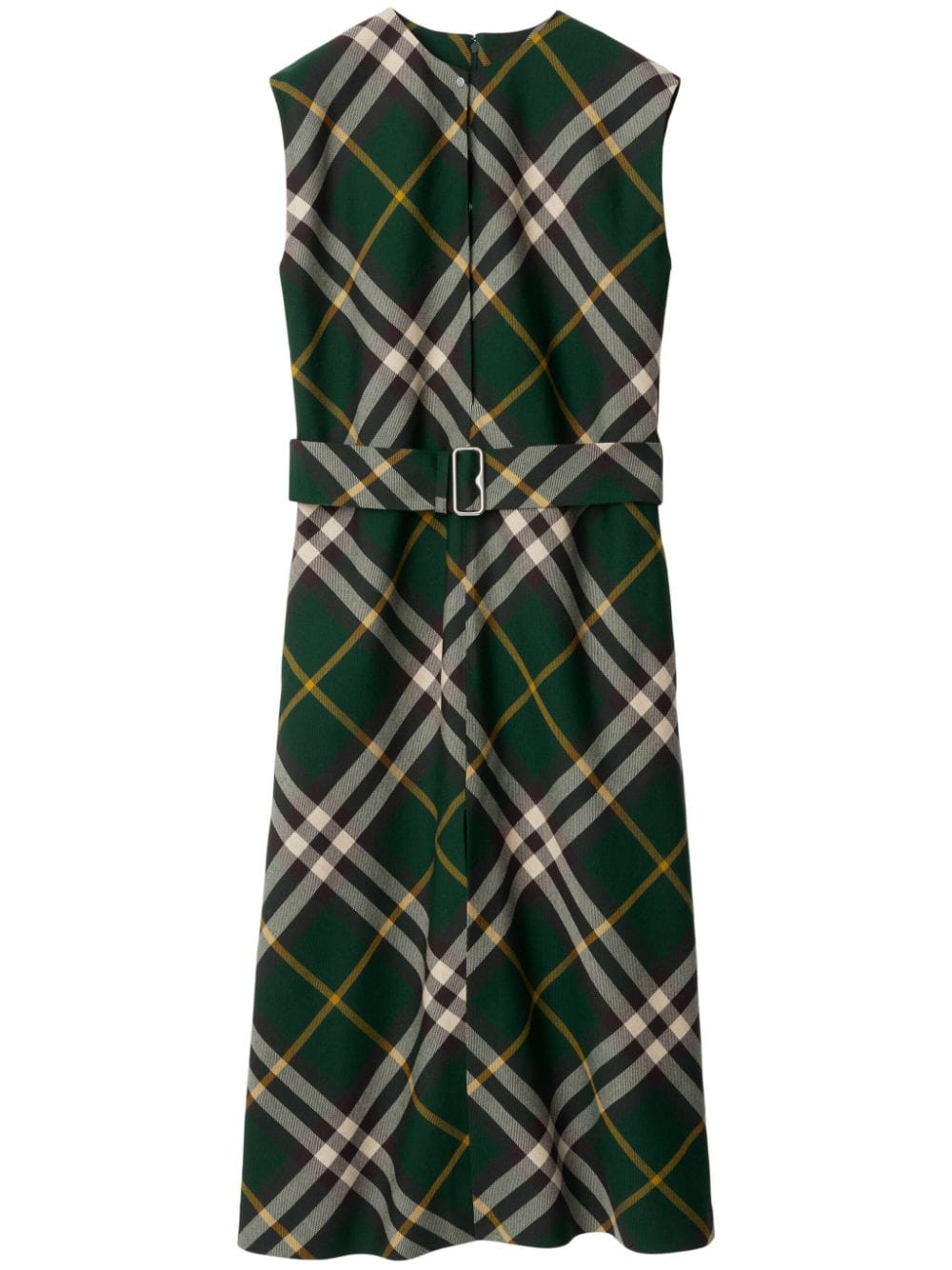 ivy green wool nova check pattern V-neck/round neck press-stud placket belted waist concealed rear hook and zip fastening sleeveless front slit rear slit mid-length silver-tone hardware Size and Fit - This piece fits true to size. We recommend you get your regular size. Model is 1,75m / 5ft 8in wearing size 8 (UK)