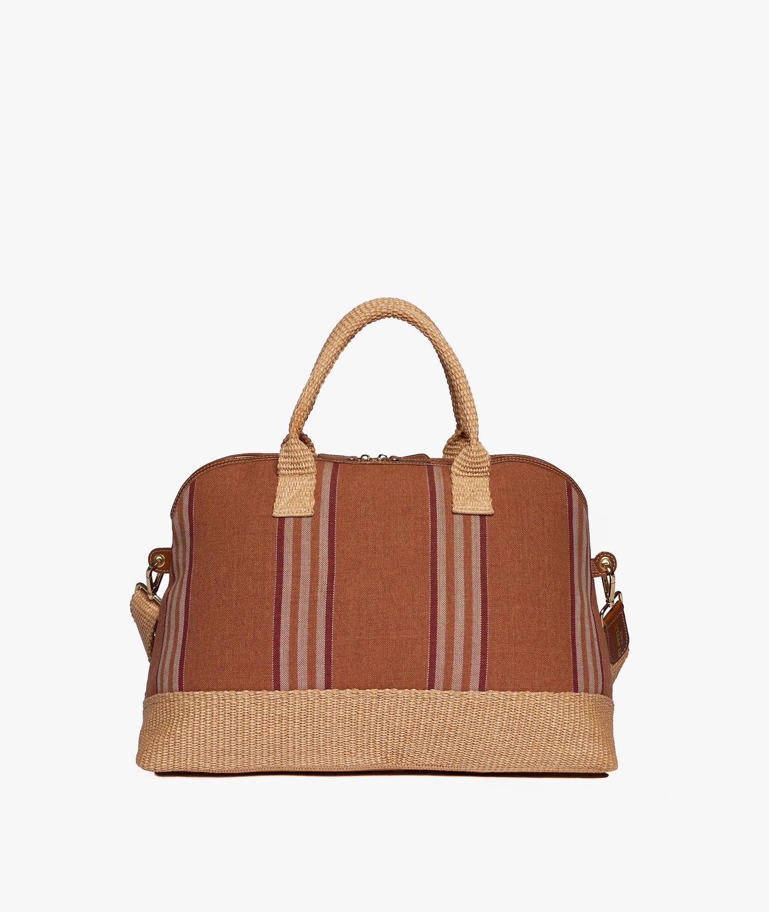 The London Smart Antibes Travel Duffle Bag in Terracotta expresses Mediterranean elegance in a deep, refined shade inspired by coastal greenery and the sunlit Riviera. The striped fabric in green, sand, and ivory creates a natural, sophisticated colour balance, while the woven straw-effect base and handles add a distinctive textured detail with timeless resort appeal.