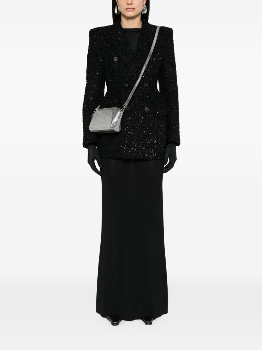 black wool blend tweed bouclé design peak lapels shoulder pads long sleeves with buttoned cuffs two front flap pockets two side inset pockets straight hem full lining double-breasted button fastening Size and Fit - This piece fits true to size. We recommend you get your regular size. Model is 1,75m / 5ft 8in wearing size 36 (FR)