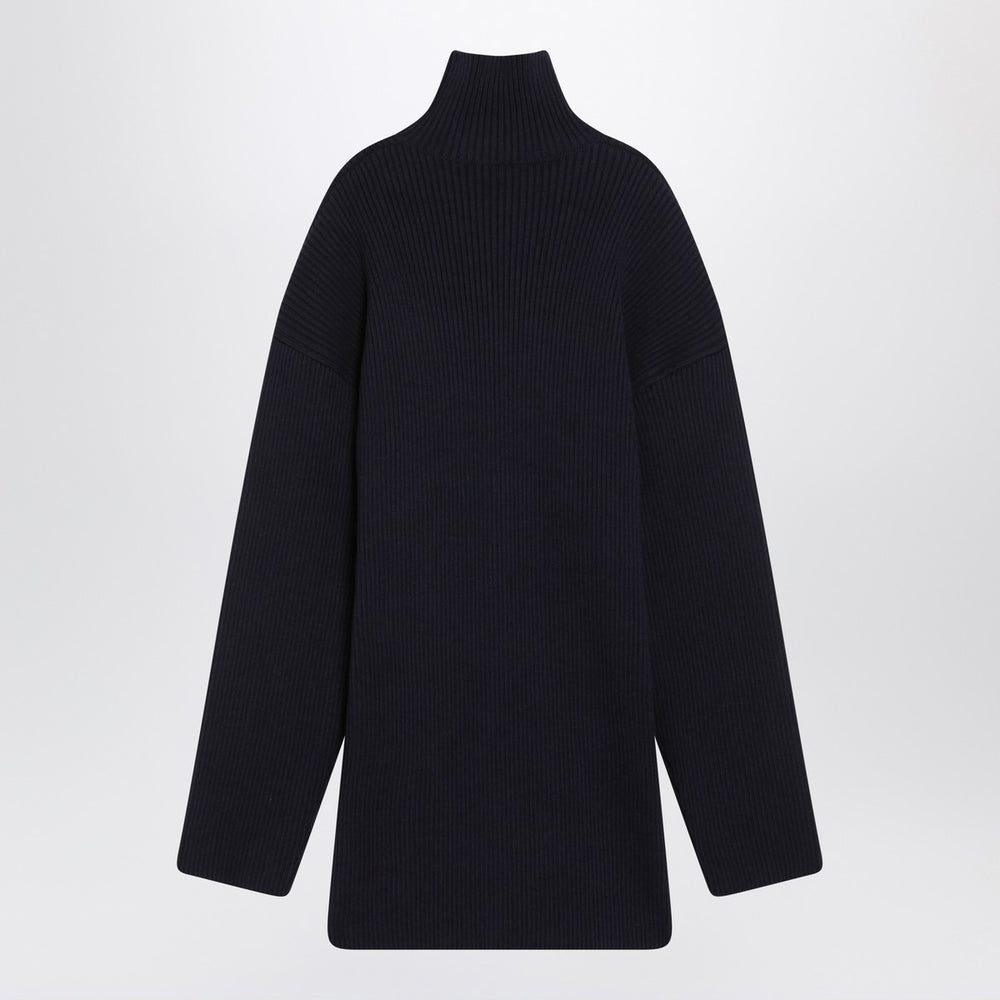 Balenciaga mini dress in navy cotton-wool blend, featuring ribbed design, wide soft turtleneck, long sleeves with dropped shoulders, and waist detail with darts and silver-tone brass clip.