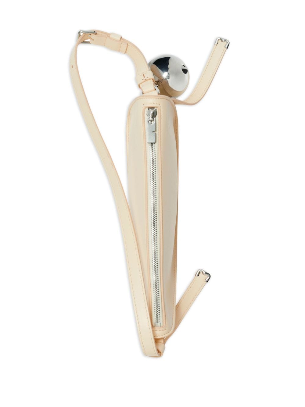 light beige lambskin signature Equestrian Knight motif silver-tone hardware bell charm top zip fastening adjustable shoulder strap main compartment.