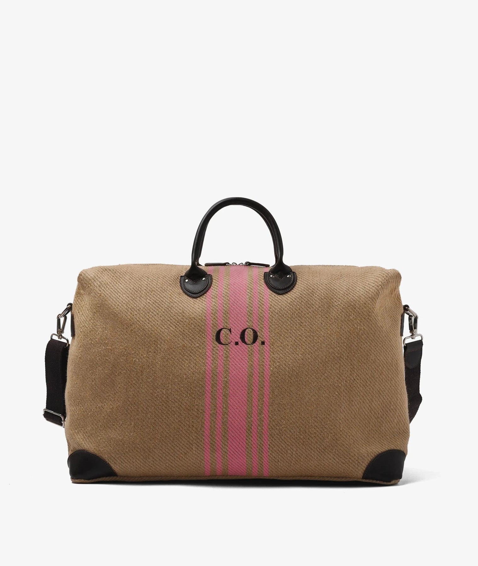 An icon of style and sophistication, the Harvard Large Yute Duffel Bag with pink stripes and dark brown leather from the SS25 summer collection is perfect for those who want a distinctive and functional accessory for any trip.