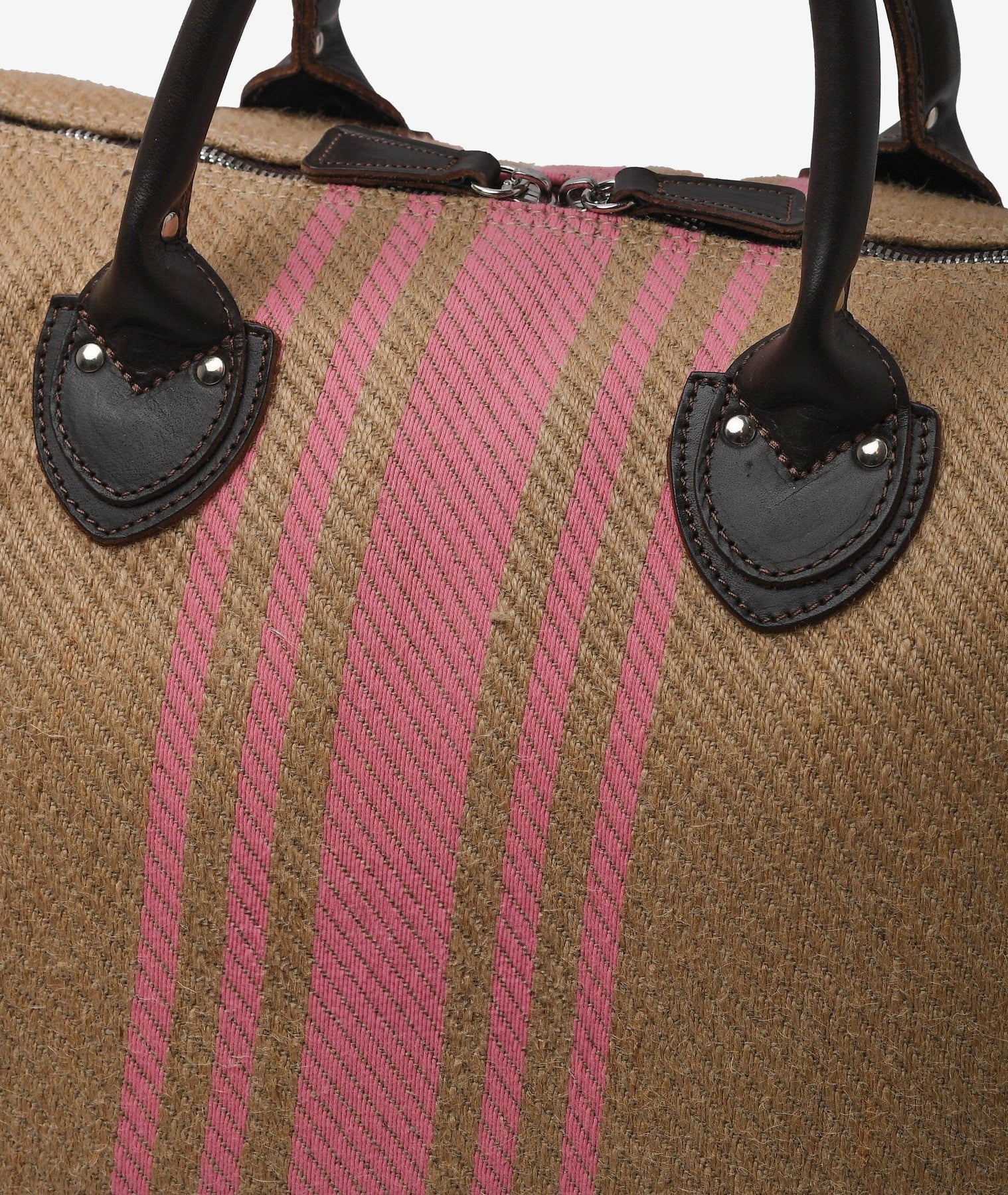 The durable jute fabric is enhanced with pink stripes of different sizes, creating a refined contrast to the dark brown leather used for the handles, piping and corner reinforcements. These details not only add a touch of elegance, but also ensure robustness and durability over time.